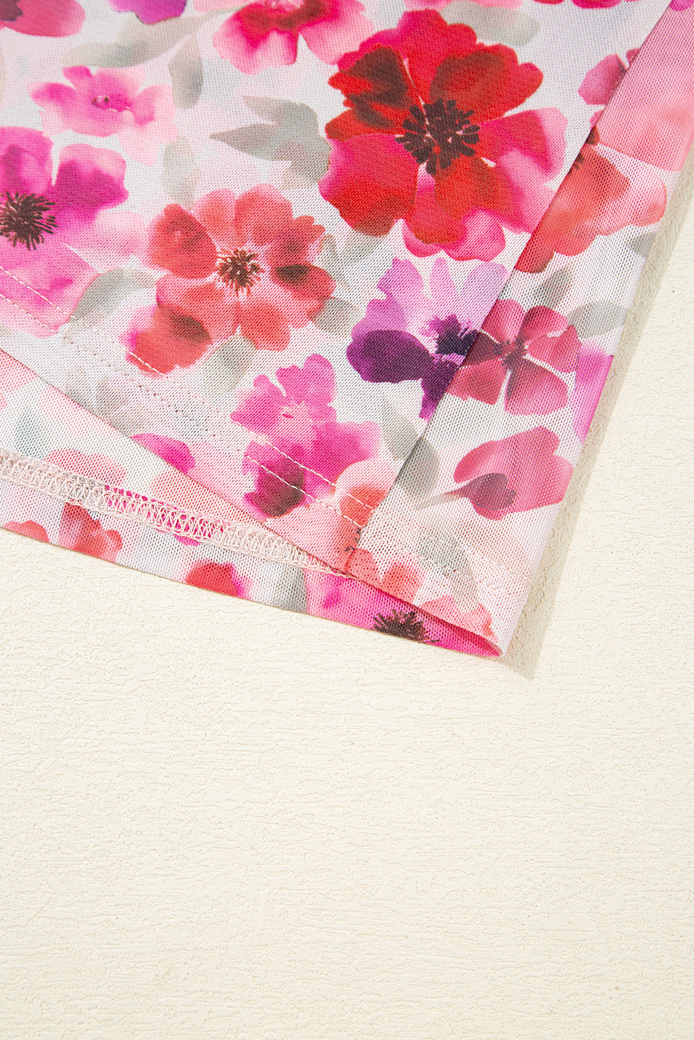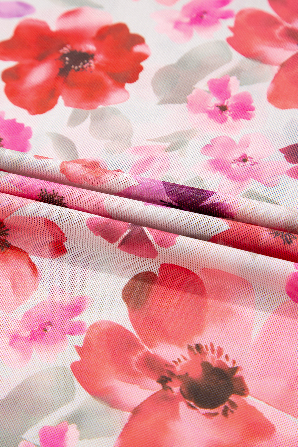 Red Floral Print Long Sleeve Slim Fit Mesh Top
